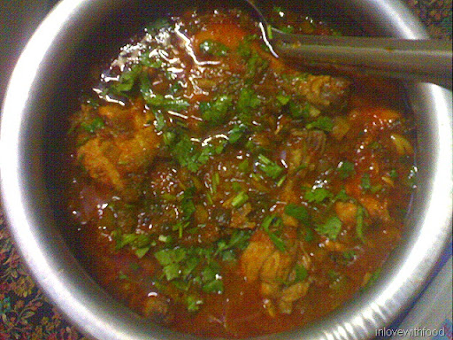 In the same ghee add ginger and garlic paste and the sliced spring onions, fry till they turn pale, add the tomatoes and cook till it leaves sides of pan, transfer to a pressure cooker, add the chicken ,the garam masala and 1/2 cup hot water along with the salt, cardamom(crushed) and pepper,close lid give one rapid whistle and remove immediately , put under running water, transfer to a serving pan and garnish with fresh coriander leaves and some fresh cream if desired.
